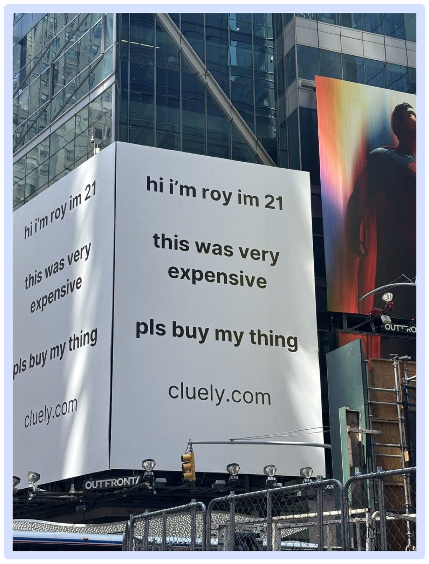Cluely put up a massive Times Square billboard that says: “hi i’m roy im 21, this was very expensive, pls buy my thing, cluely .com”
