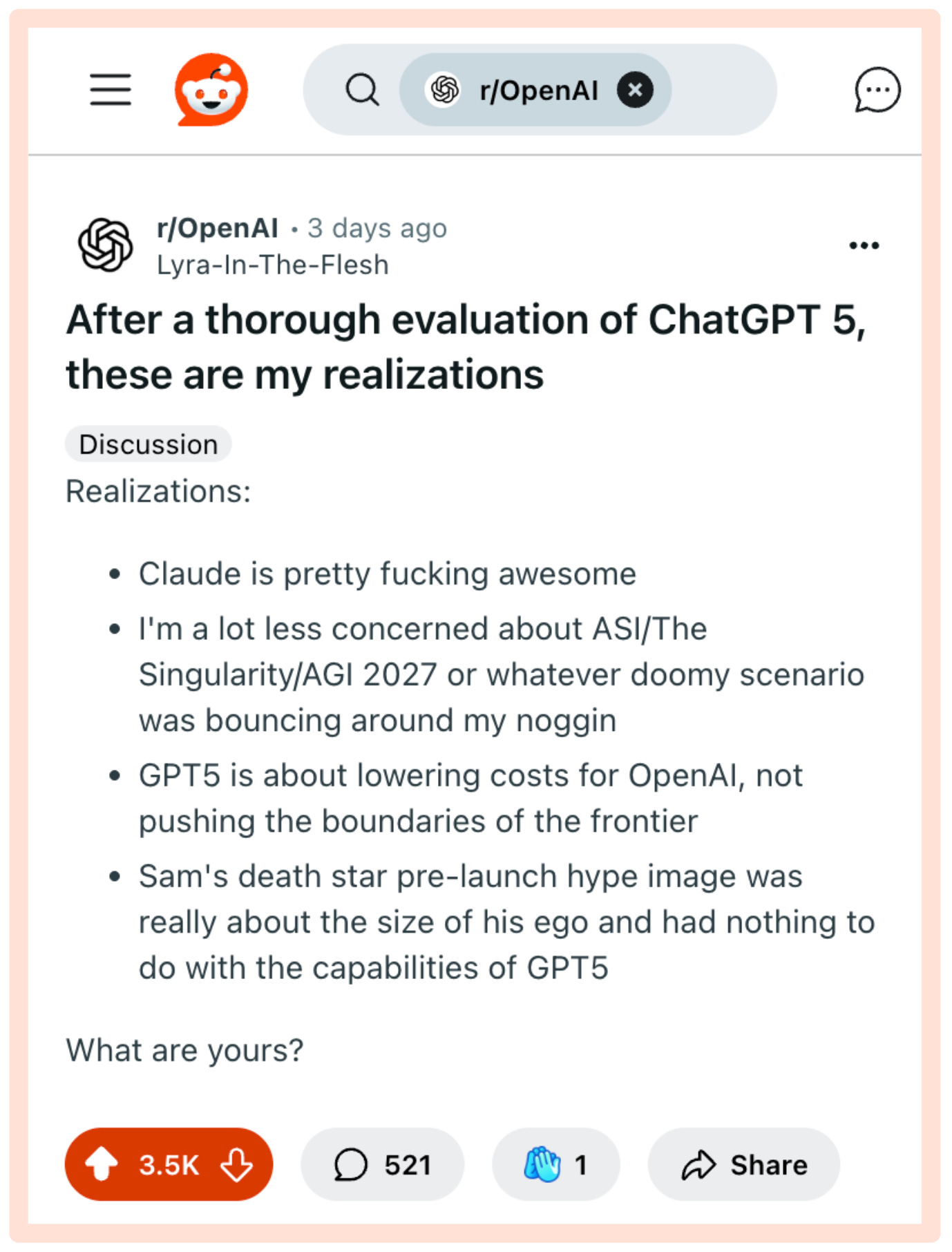 The most upvoted post on r/ChatGPT this week: “GPT-5 is about lowering costs for OpenAI, not pushing boundaries”