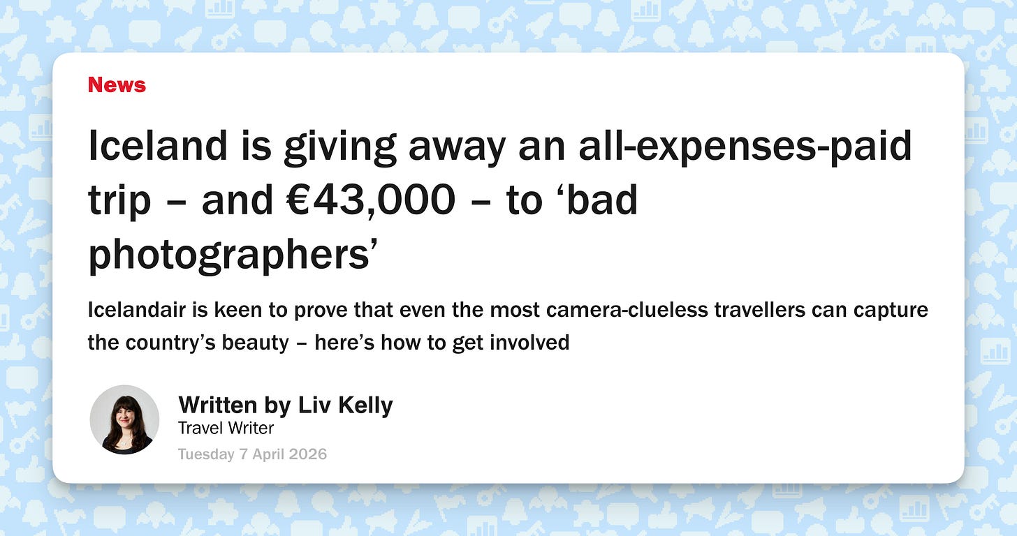 The gig: Go to reallybadphotographer.com (cool domain), upload your worst photos, and if youâre bad enough â you win a 10-day trip to Iceland, $50K, and your âphotosâ in a global campaign. Applications open until April 30.
