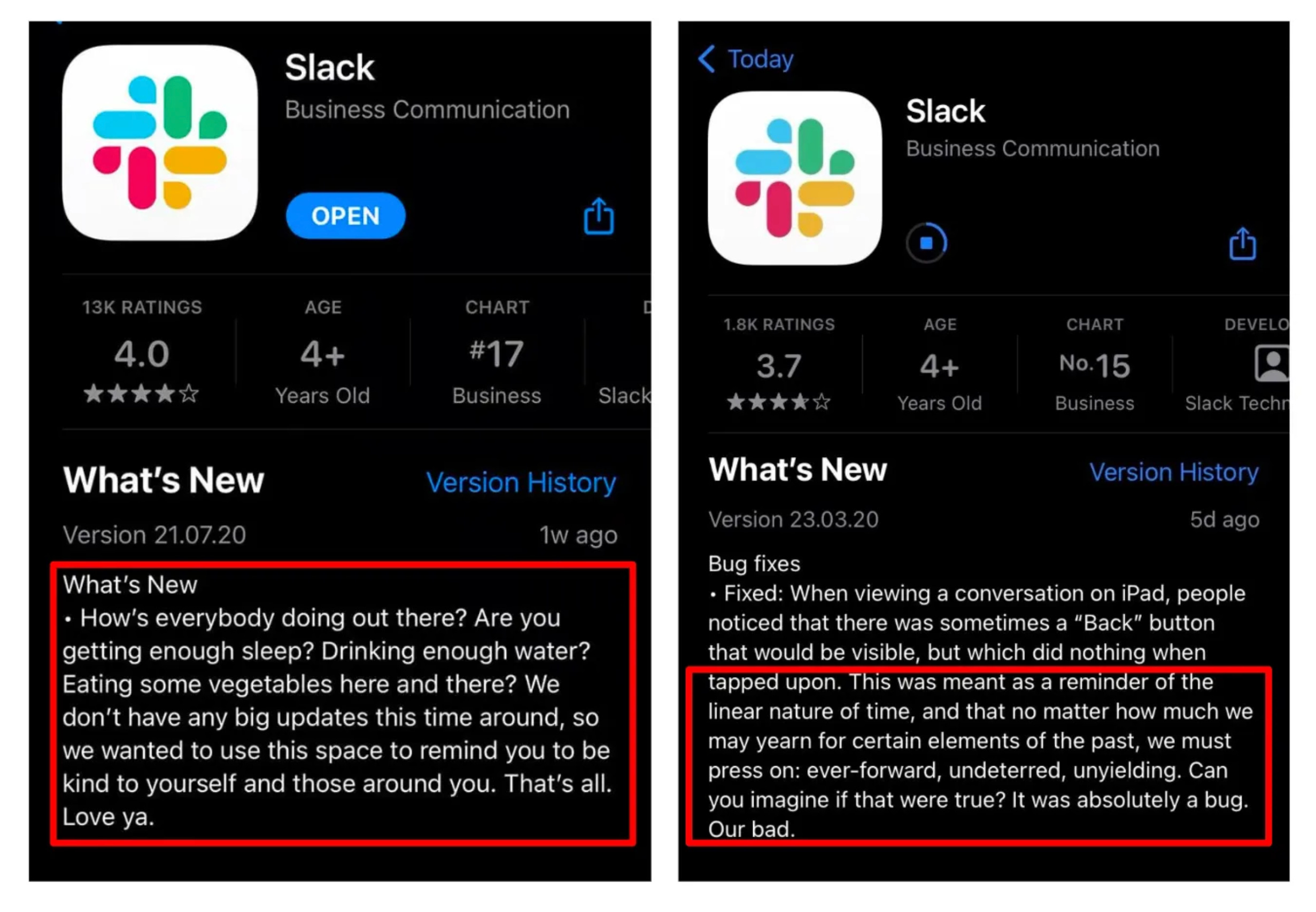 This is exactly what Slack does with their App Store release notes. No one actually reads them. So the marketing team of Slack stopped pretending anyone would: