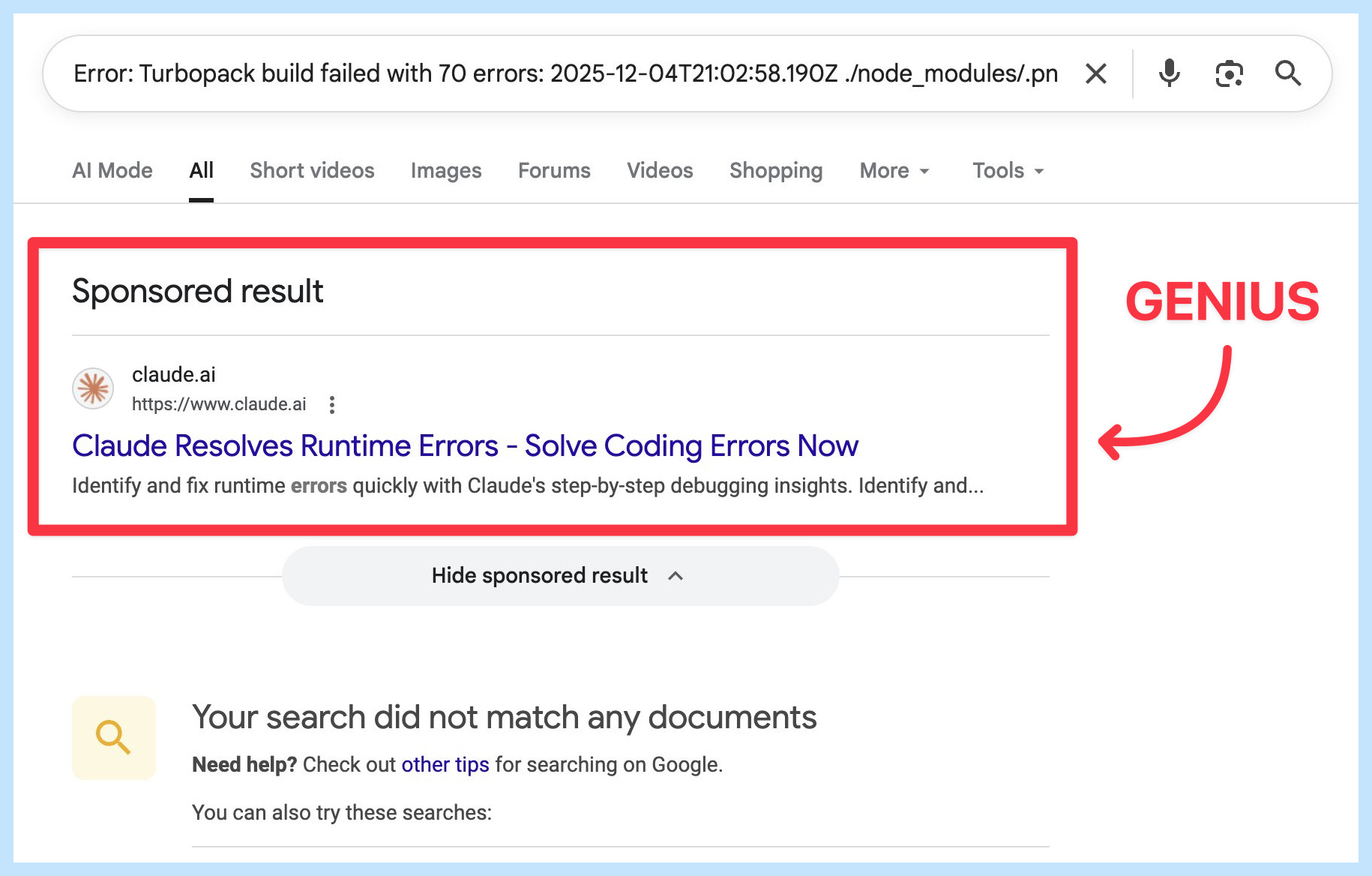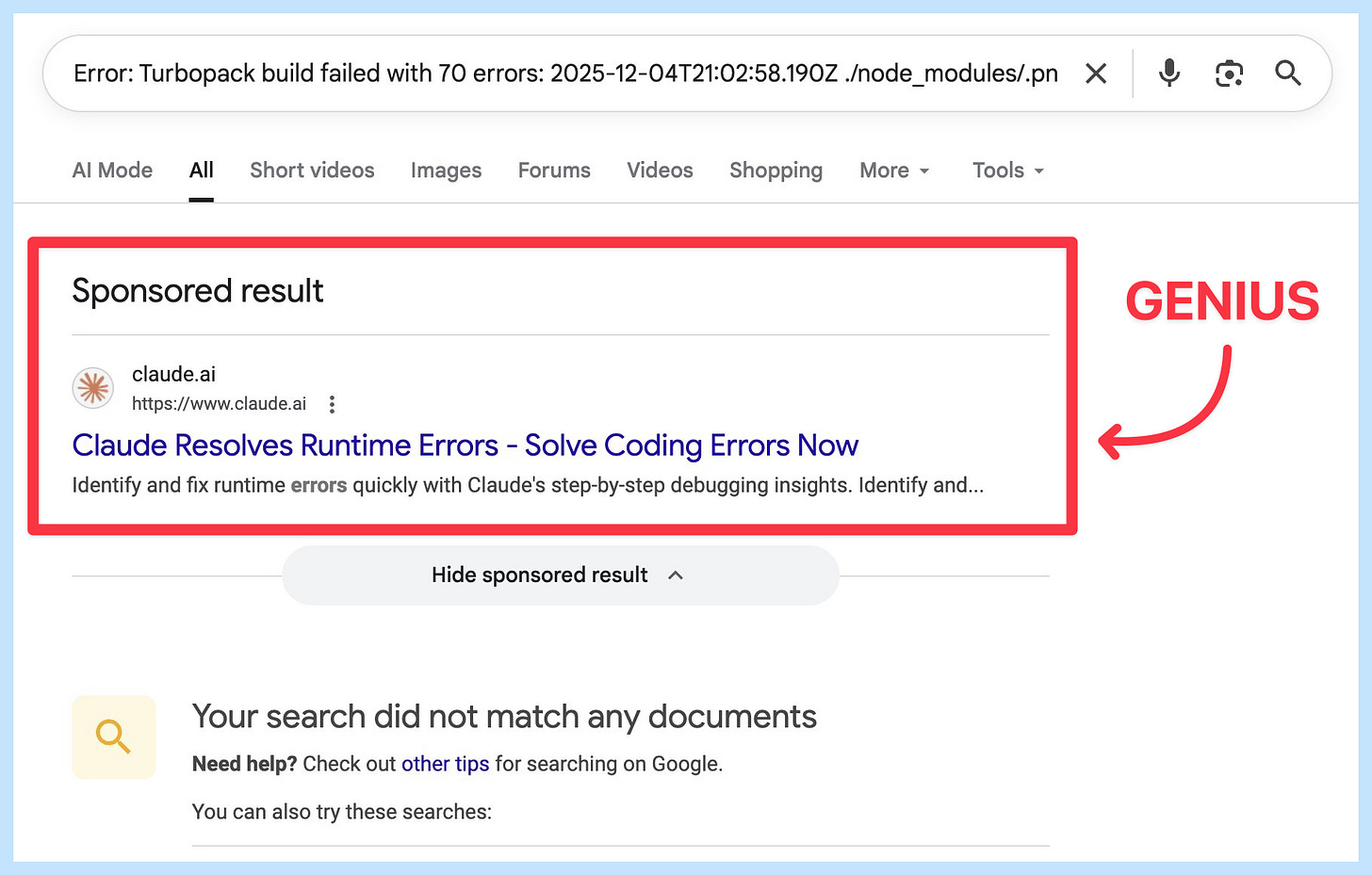 Think about it: Someone is literally stuck, already googling for a fix, and Anthropic shows up saying “I can solve this for you right now”.