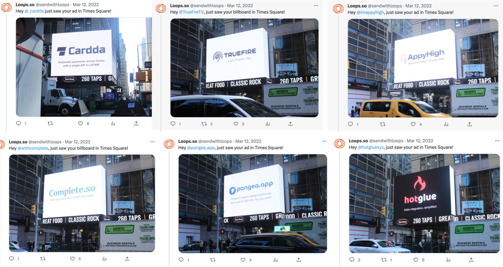 Create personalized social posts. This is my fav step (if they don’t share it). Share it, but don’t just say “we featured [someone]”! Create individual posts for each company/person and make it look spontaneous: “Just saw @[someone] on Times Square!” like Loops did. Let featured people “discover” it and share organically.