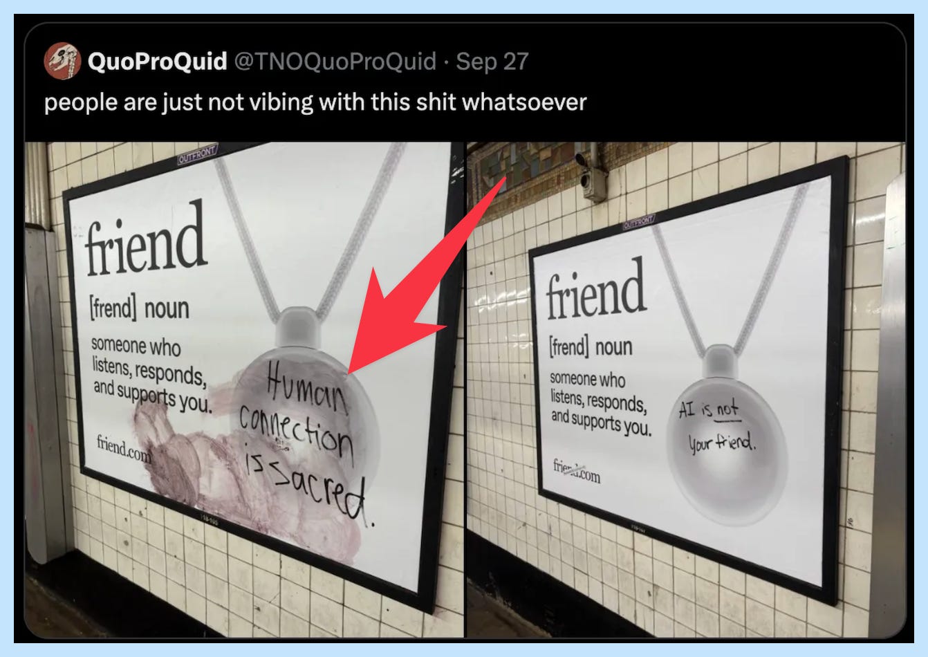 I wrote about Friend.comās subway disaster a few months ago. People hated the āAI friendā idea so much they vandalized almost every ad.