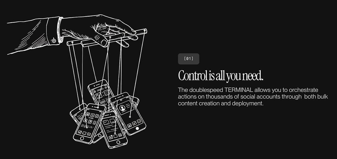 A company called DoubleSpeed (backed by a16z) promises to “control thousands of social media accounts with AI” for bulk content creation.