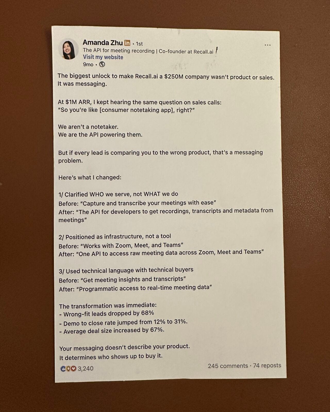 Amanda Zhu took her best-performing LinkedIn post, printed it on a postcard, and mailed it to the home address of Tenali's CEO.