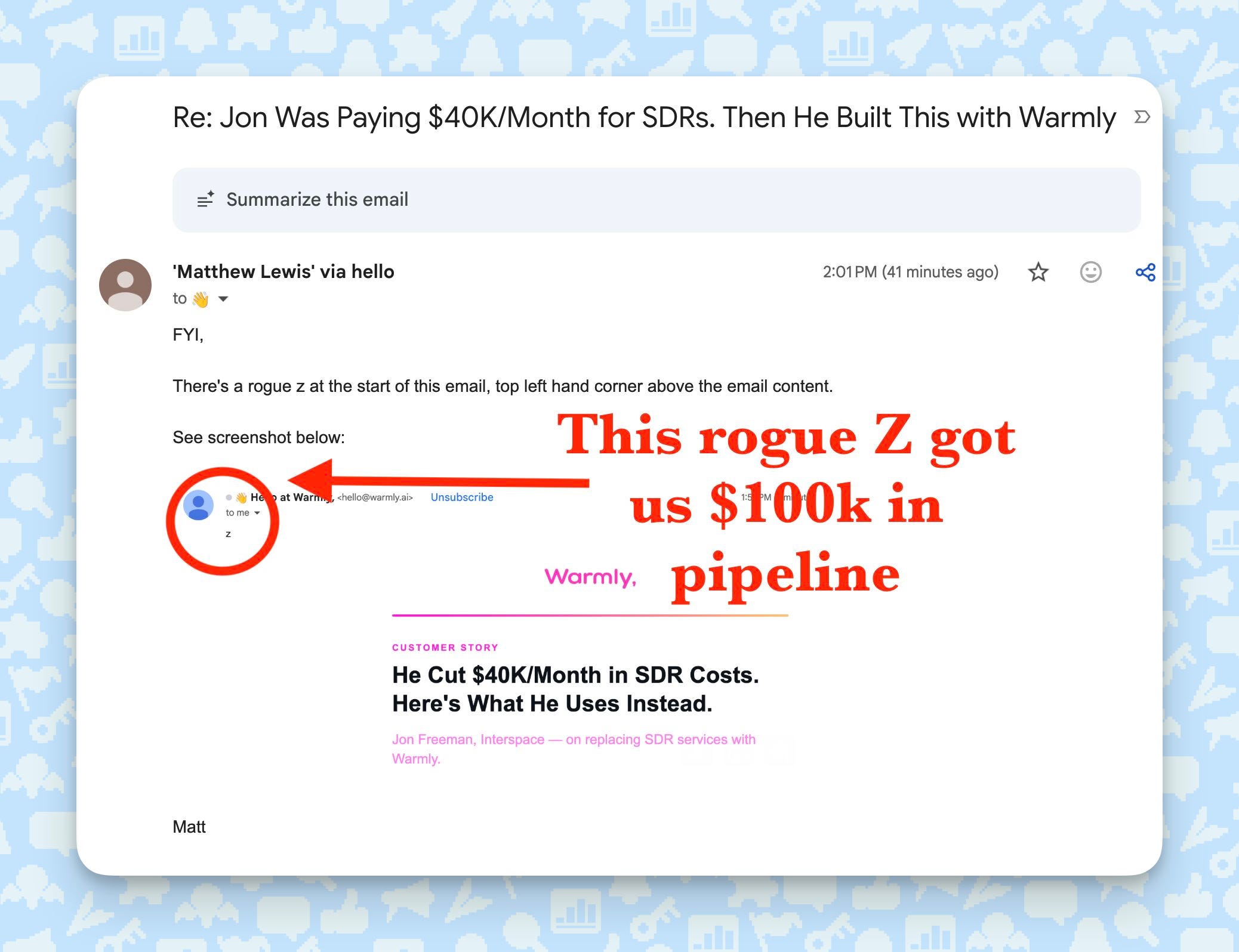 Warmly sent an email to 83,000 marketers last week. But their cofounder Alan accidentally left a lowercase “z” floating in the top-left corner.