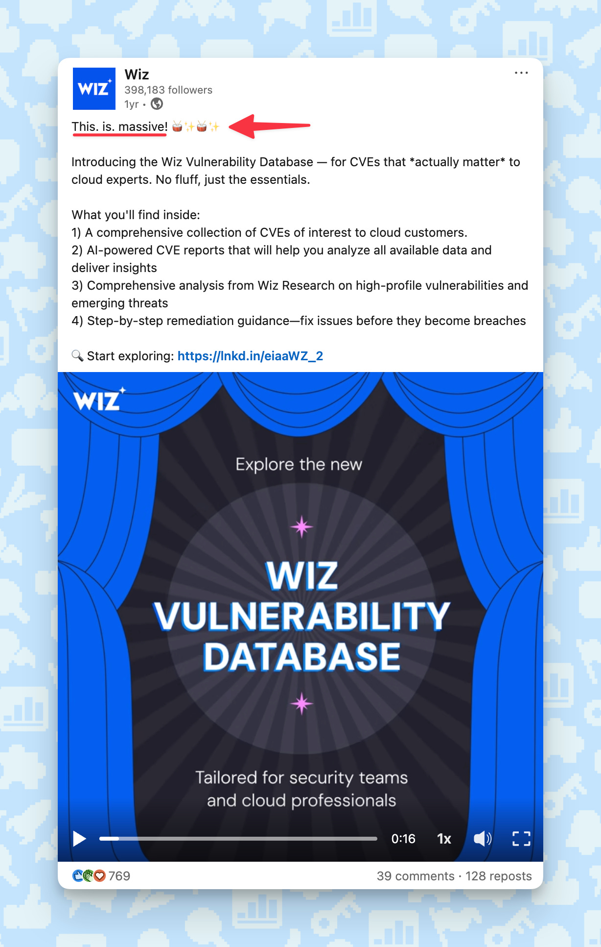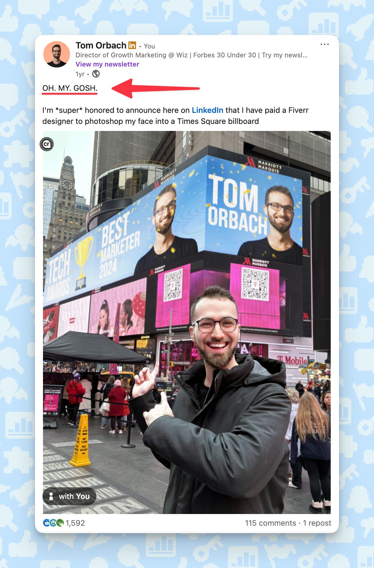 Pattern interrupts are my single best LinkedIn trick. I used them to grow Wiz’s page from zero to 400K followers, and some of those posts crossed 1 million impressions. The pattern interrupt is a big reason why.