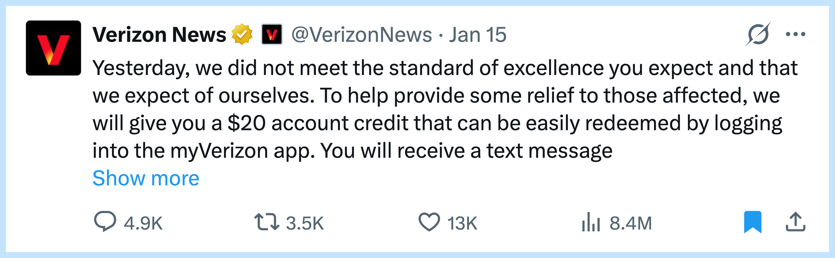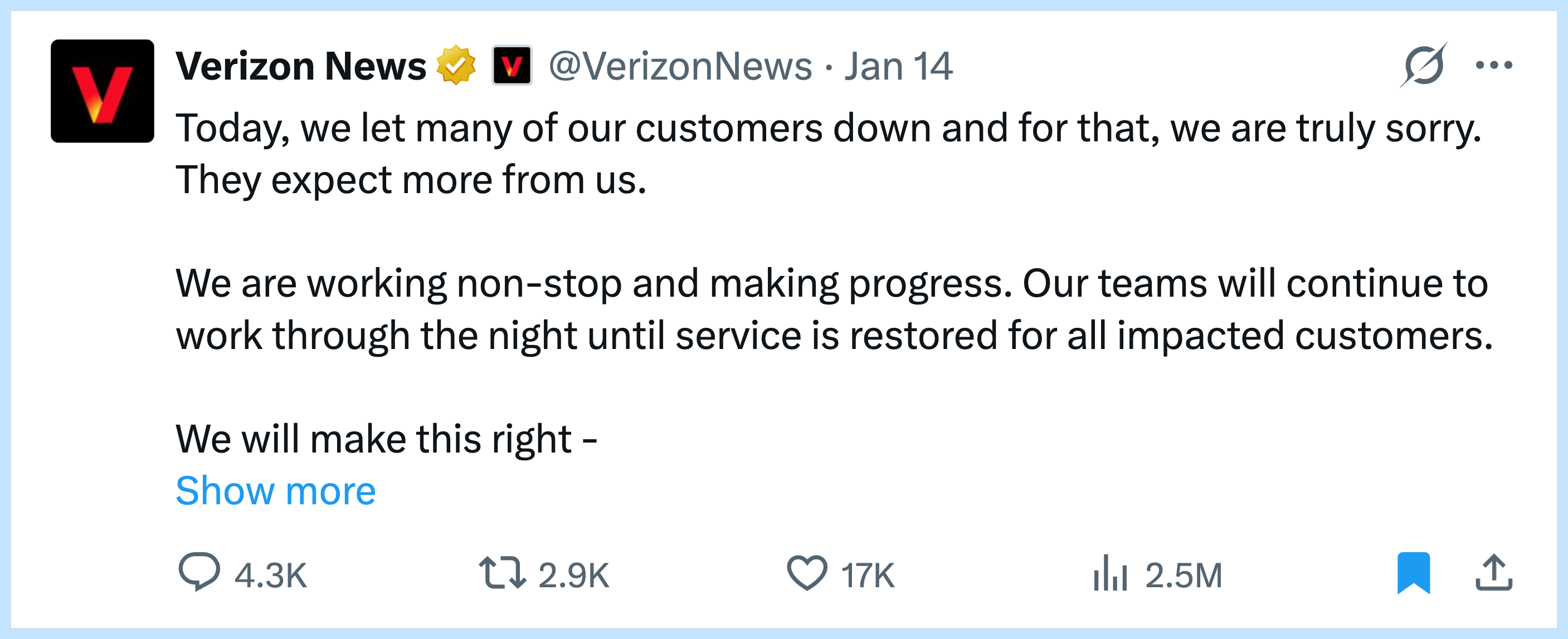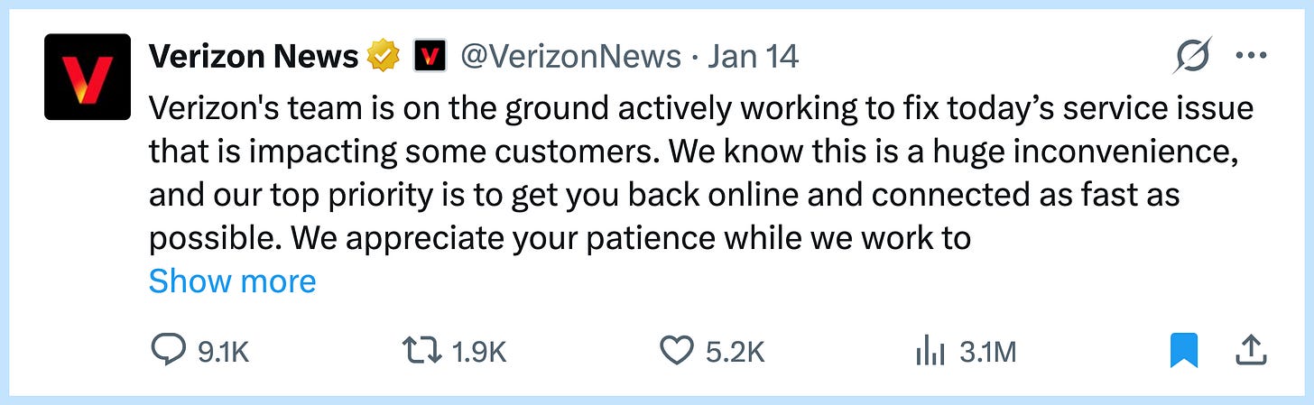 My take: Many comms teams apologize badly. They use corporate speak and minimize the problem. Verizon owned it. “They expect more from us” is a simple phrase that shows they actually get it. Save this as a template for your next crisis.