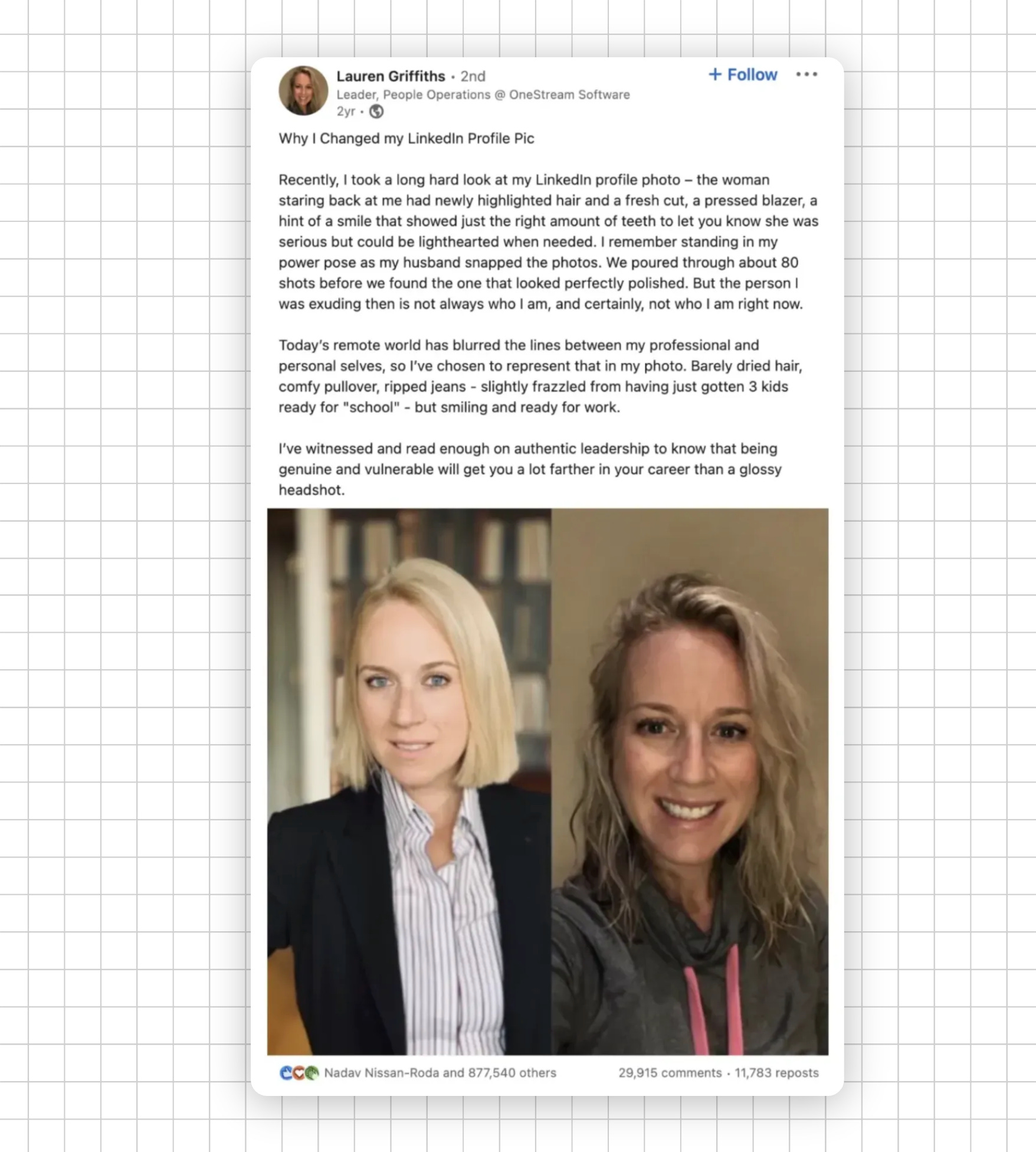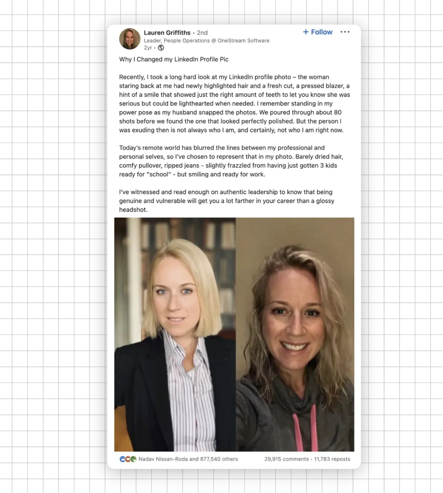 LinkedIn’s most viral post ever? A woman who swapped her professional headshot for a no-makeup selfie. 850,000+ likes.