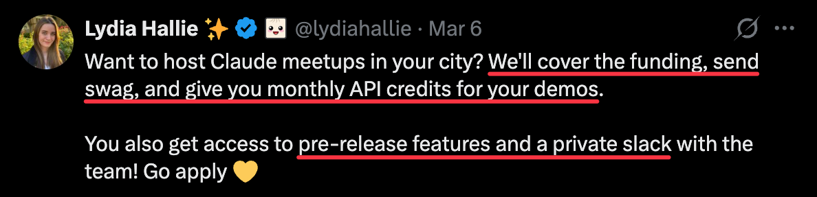 And it’s good for acquiring *new* customers too: Someone’s friend invites them to a local tech meetup → they show up → and suddenly they know about Claude.