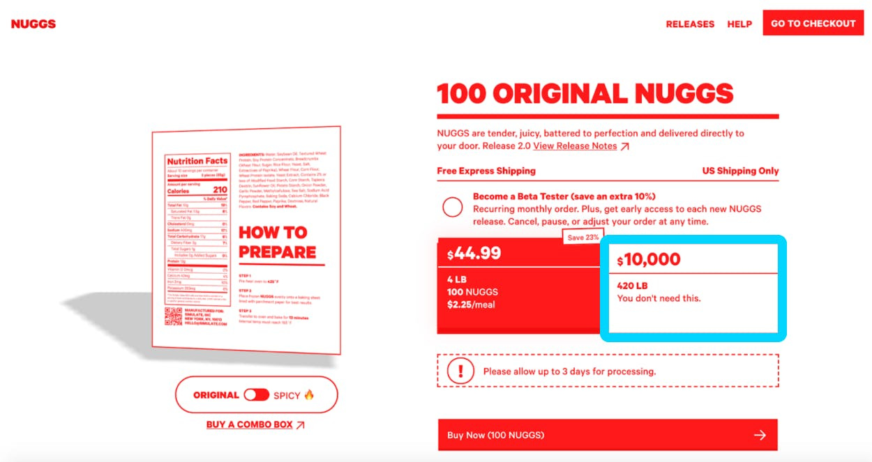 Think back to Uber's early days when they offered $3,000 helicopter rides, NUGGS tempting customers with a chance to buy 200kg of chicken nuggets for $10,000, Mailchimp's absurd premium plan, or Typeframes' white glove service, priced at a confusing 20 times more than their most expensive monthly plan.