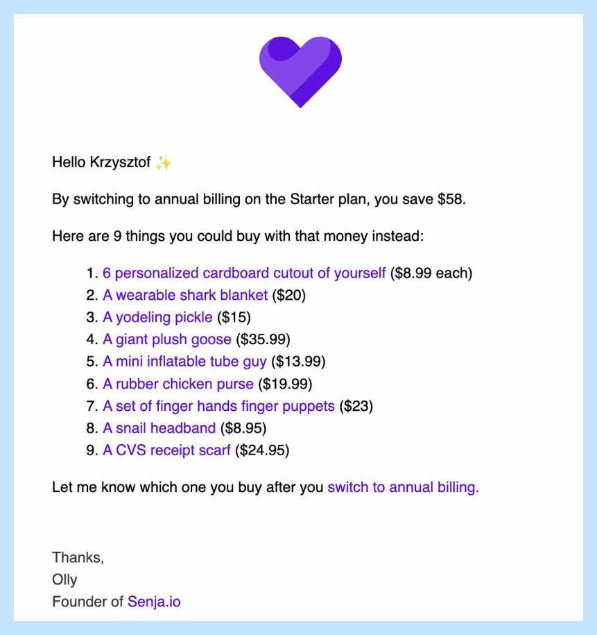 My take: This is the kind of email people screenshot and post on LinkedIn/X (which is exactly how I found it). If your product saves people money or time, show them something stupid they could do with it. That one email becomes free marketing.