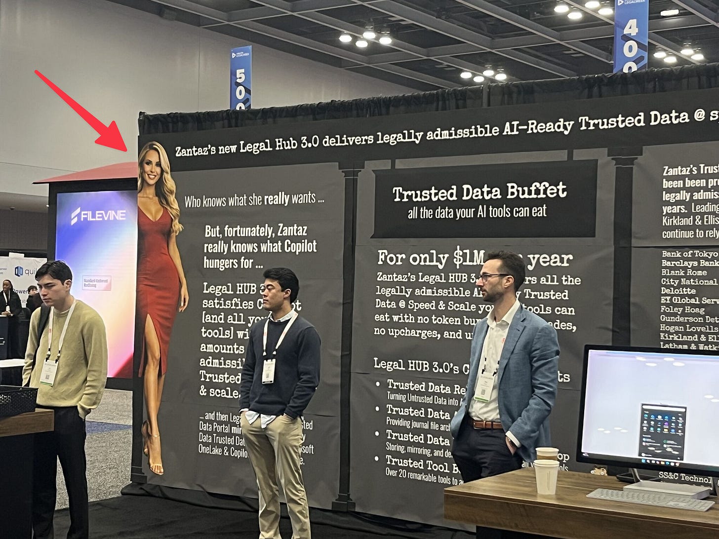 At LegalWeek in New York, a company called Zantaz put up a booth featuring an AI-generated woman in a tight red dress and text “Who knows what she really wants...”