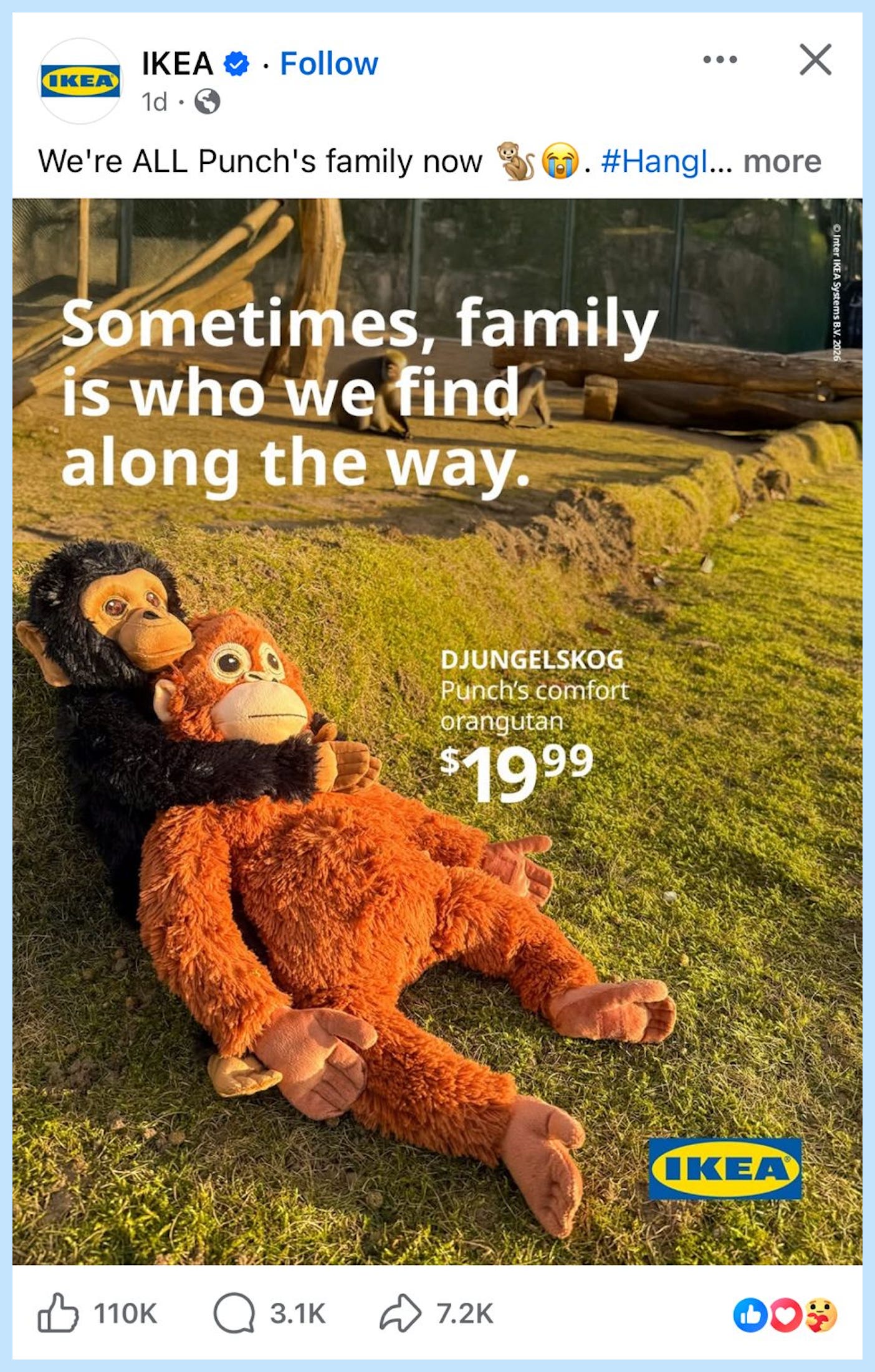 When something goes viral and your brand wants to participate, you can’t just show up and sell. The donation is what gave IKEA permission to enter the story. After that, every ad they ran (”Punch’s comfort orangutan”) felt natural instead of forced.