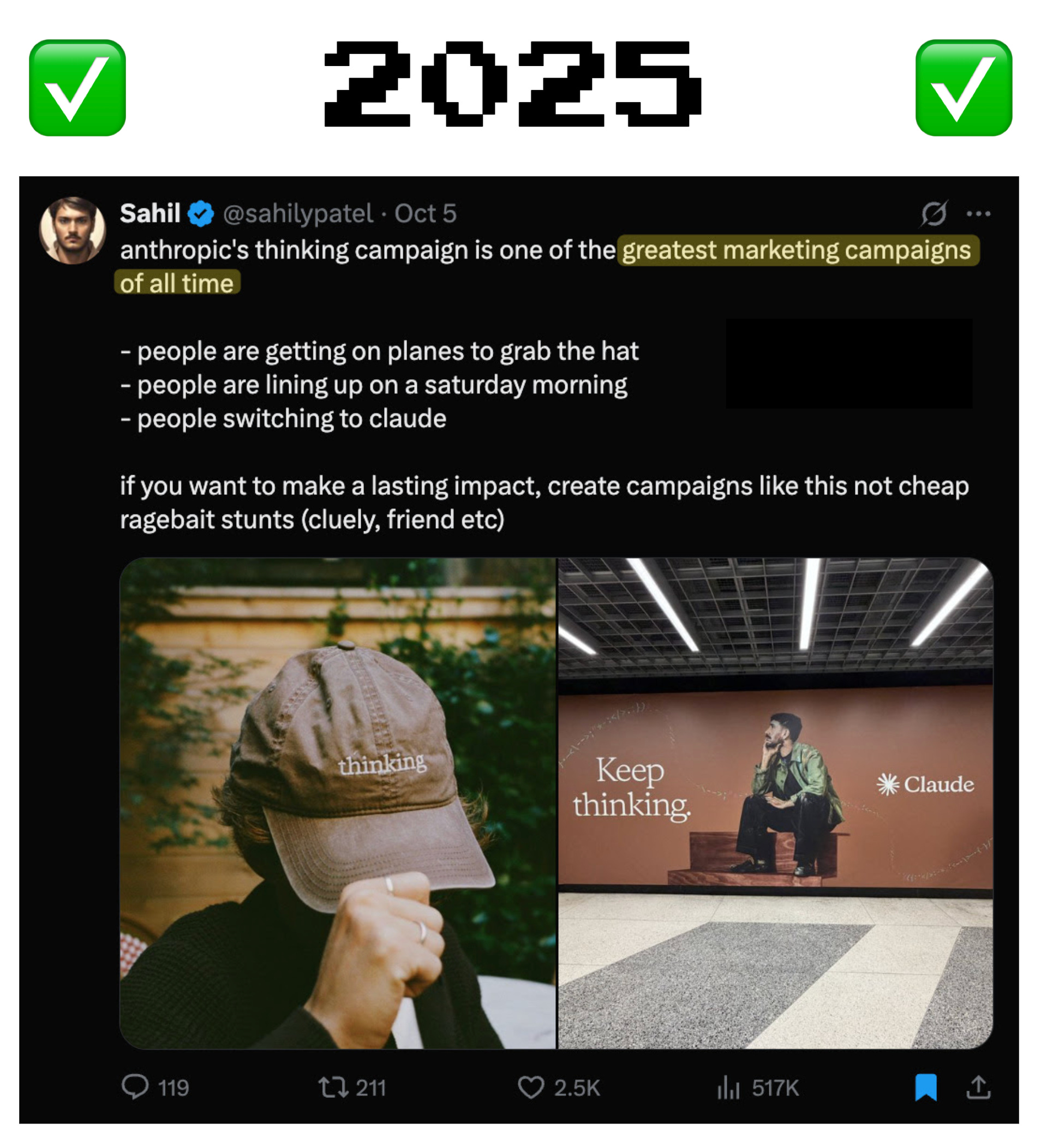 They launched their “Keep Thinking” campaign and popup coffee shop. The entire positioning became anti-slop. Against AI-generated garbage. For actual human thinking. Keep thinking.