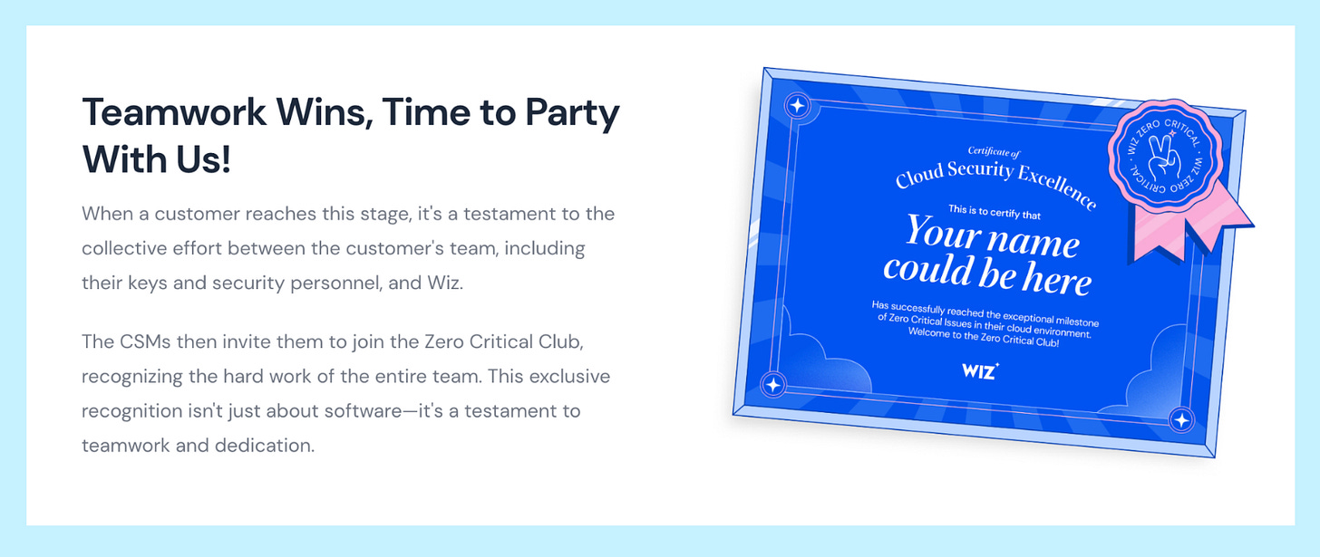 Our “Zero Critical Club” celebrates Wiz customers who eliminate all critical security issues using our platform. When they reach zero, we send a personalized certificate.